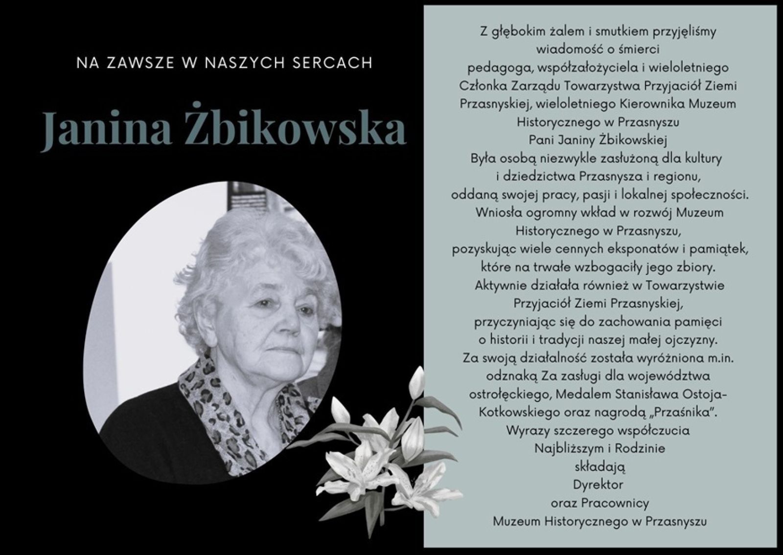 Z ogromnym żalem informujemy, że zmarła Pani Janina Żbikowska, wieloletnia kierownik Muzeum Historycznego w Przasnyszu.